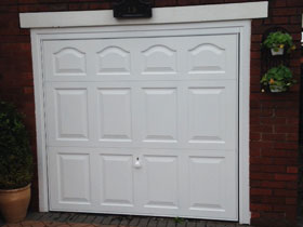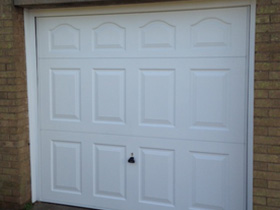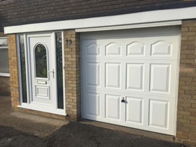 Garador cathedral up and over garage door in white. |