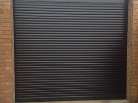Brown compact electric roller garage door. |