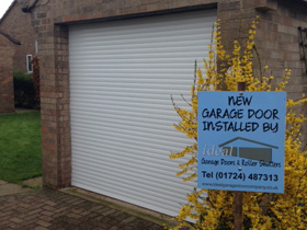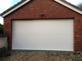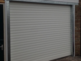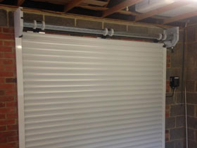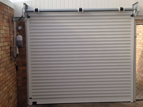 White Electric roller garage door. |