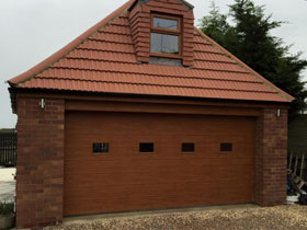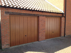 Two Garador Golden oak Sherwood up and over garage doors. |