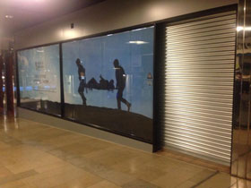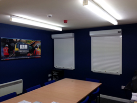 | 2no White compact security roller shutters. Internally installed to training room windows. |
