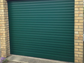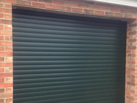 Dark green electric roller garage door.
